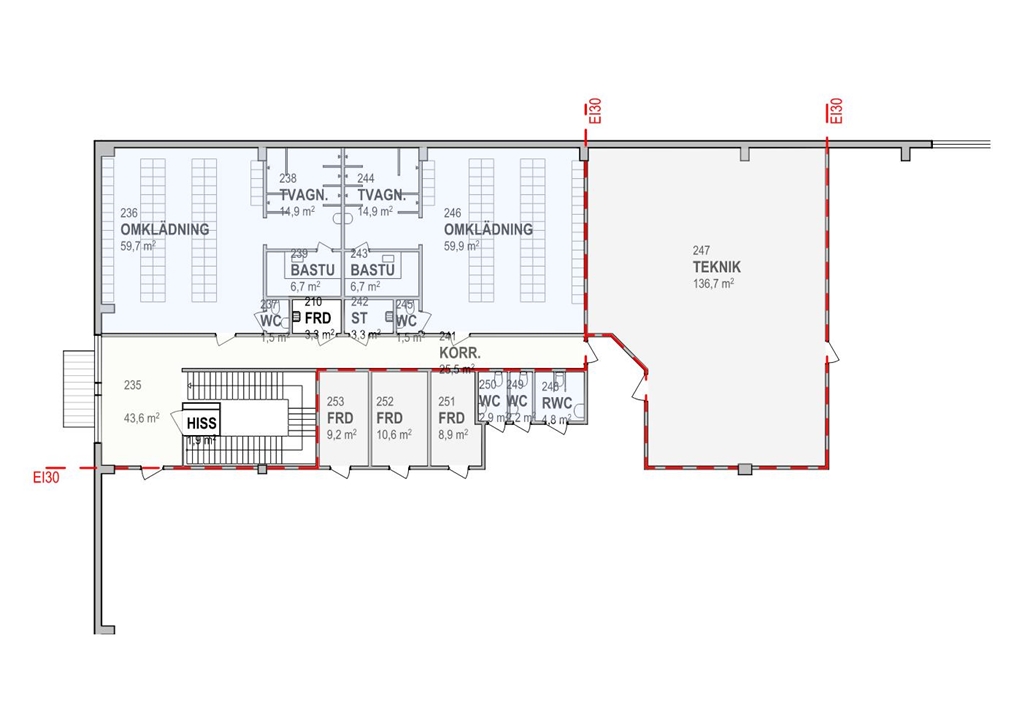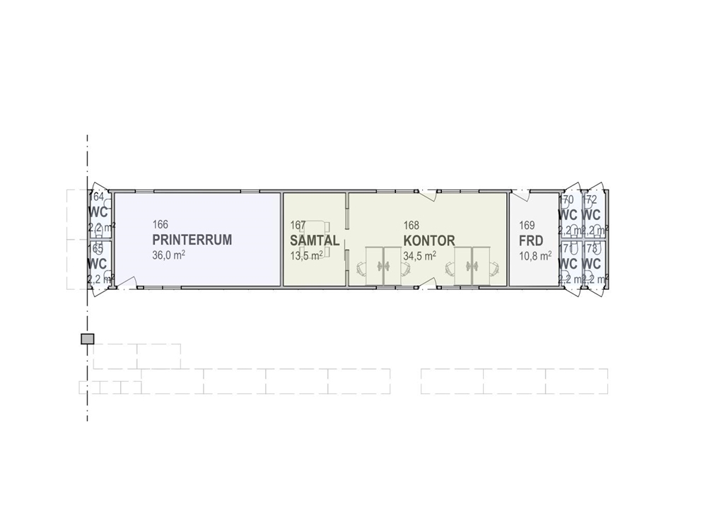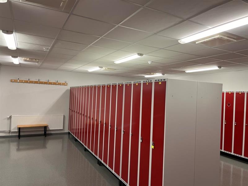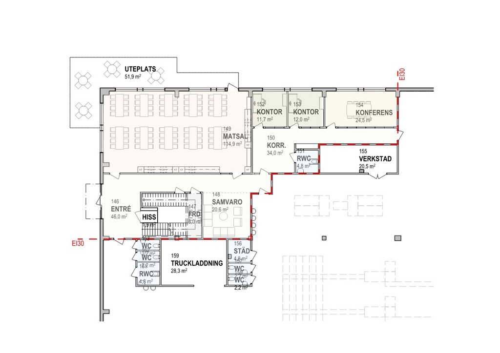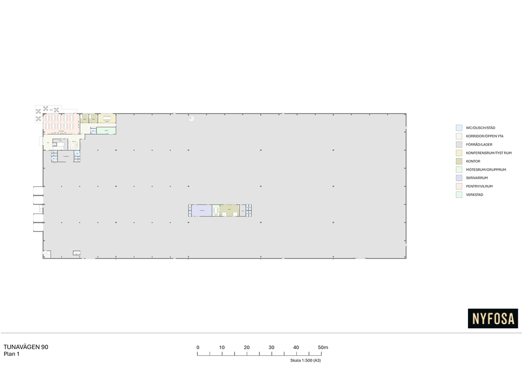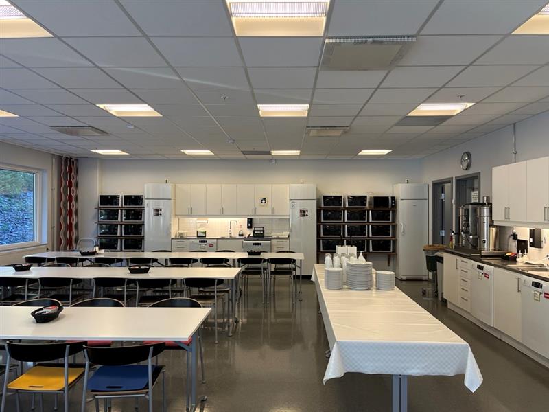 Här finns fullt utrustade kontors- och mötesrum som ger en smidig arbetsmiljö för både administration och planering. För personalens bekvämlighet finns två stora omklädningsrum, vilket gör lokalen perfekt för verksamheter med många anställda. Dessutom finns en trevlig uteplats där personalen kan koppla av under pauser.