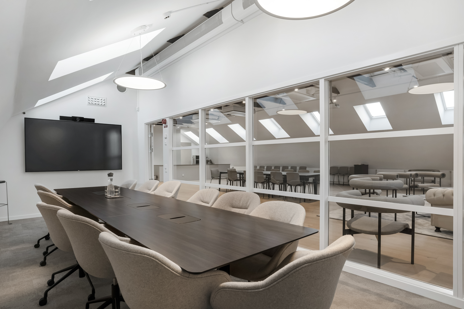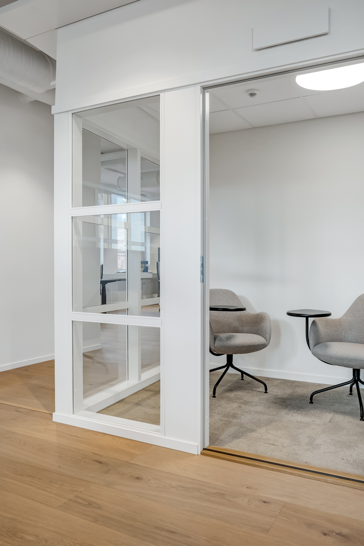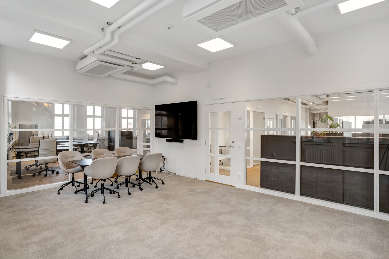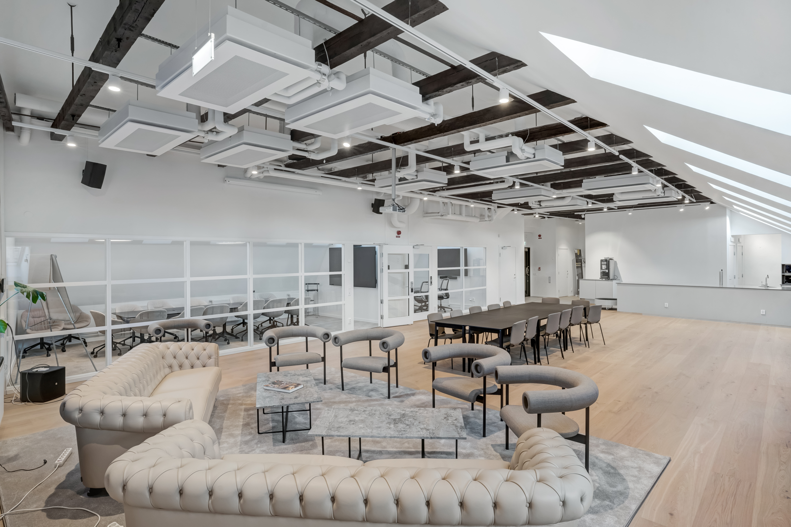 Övre plan har stora öppna ytor med låsbara konferensrum.