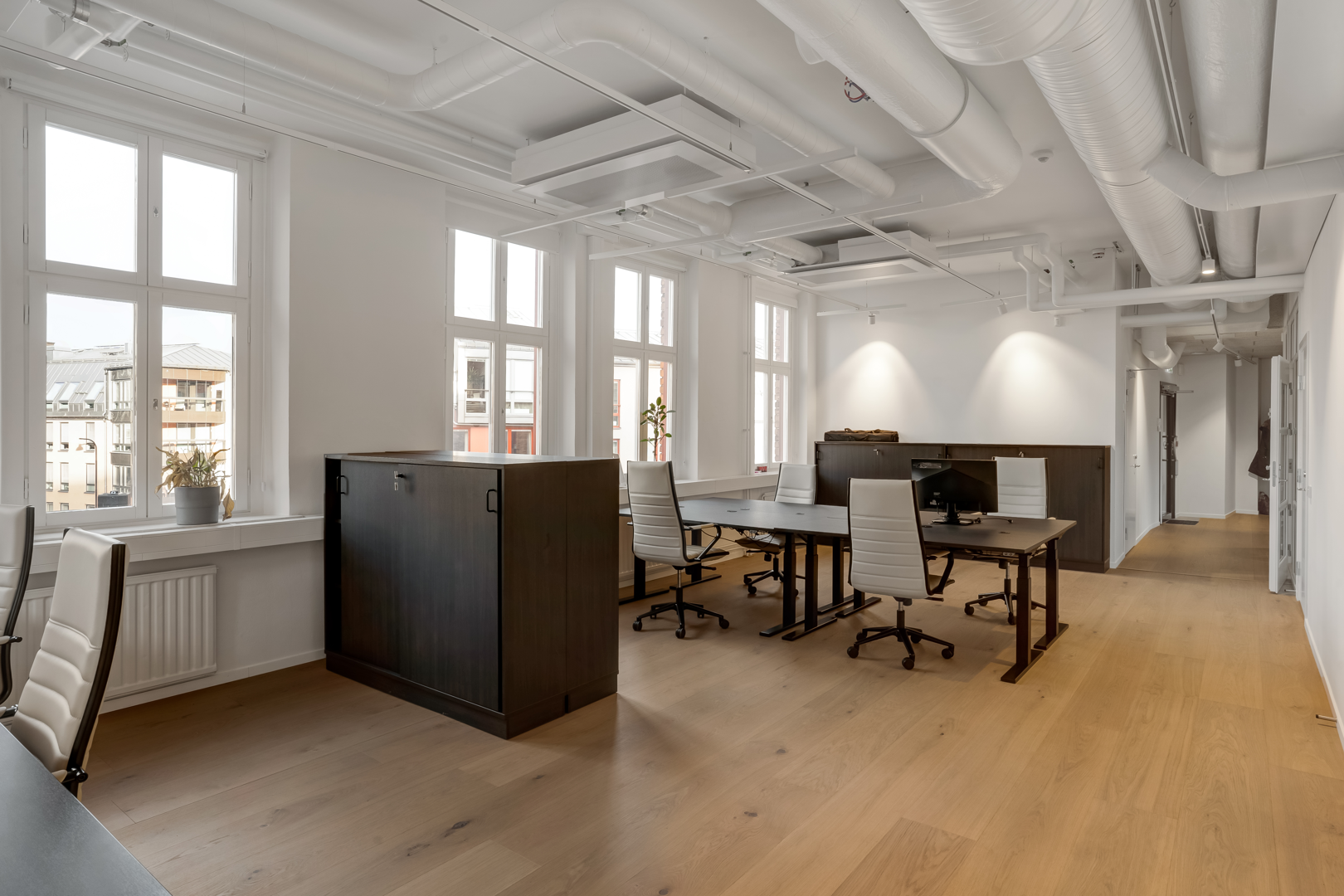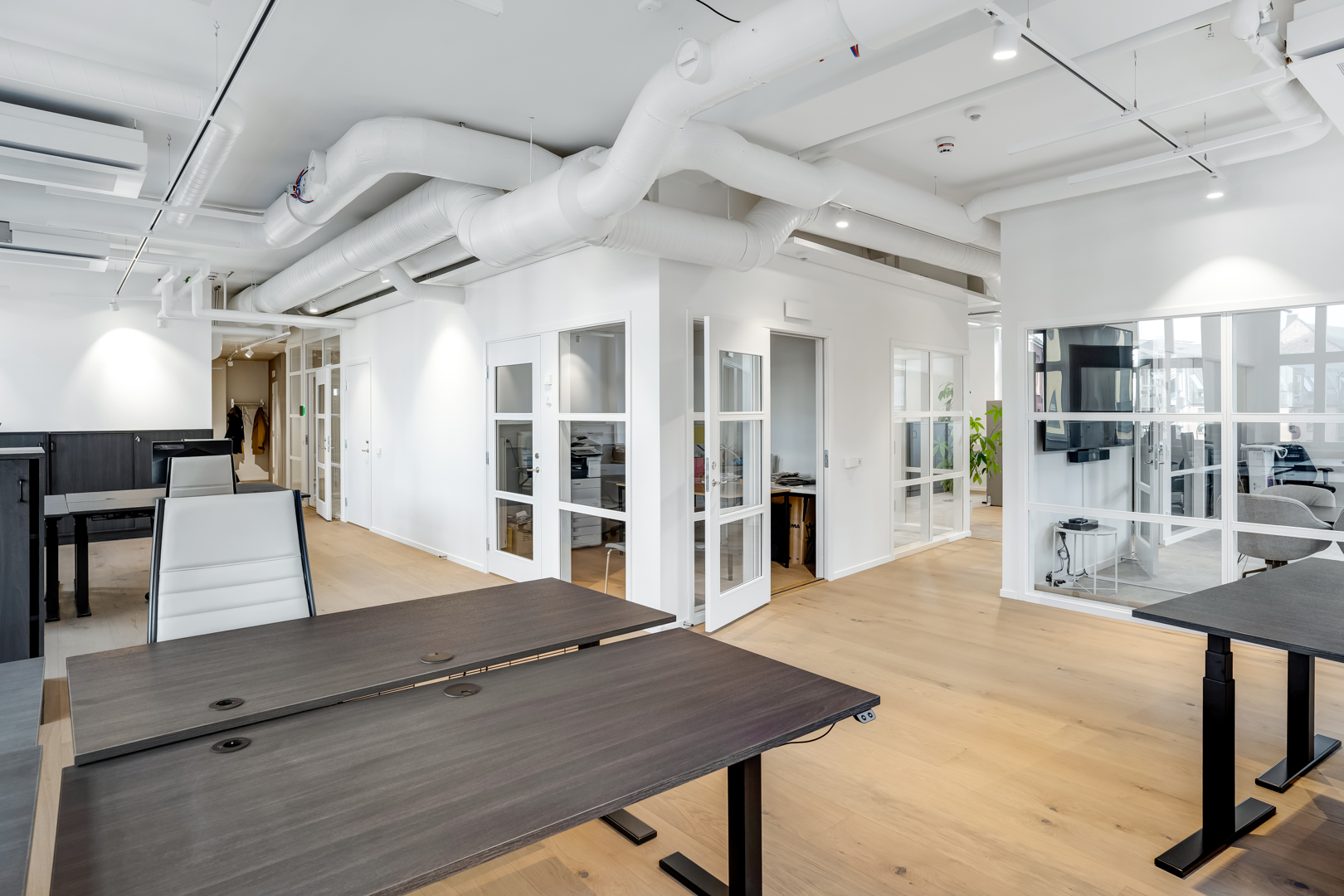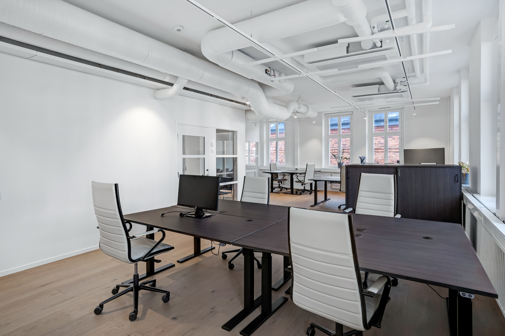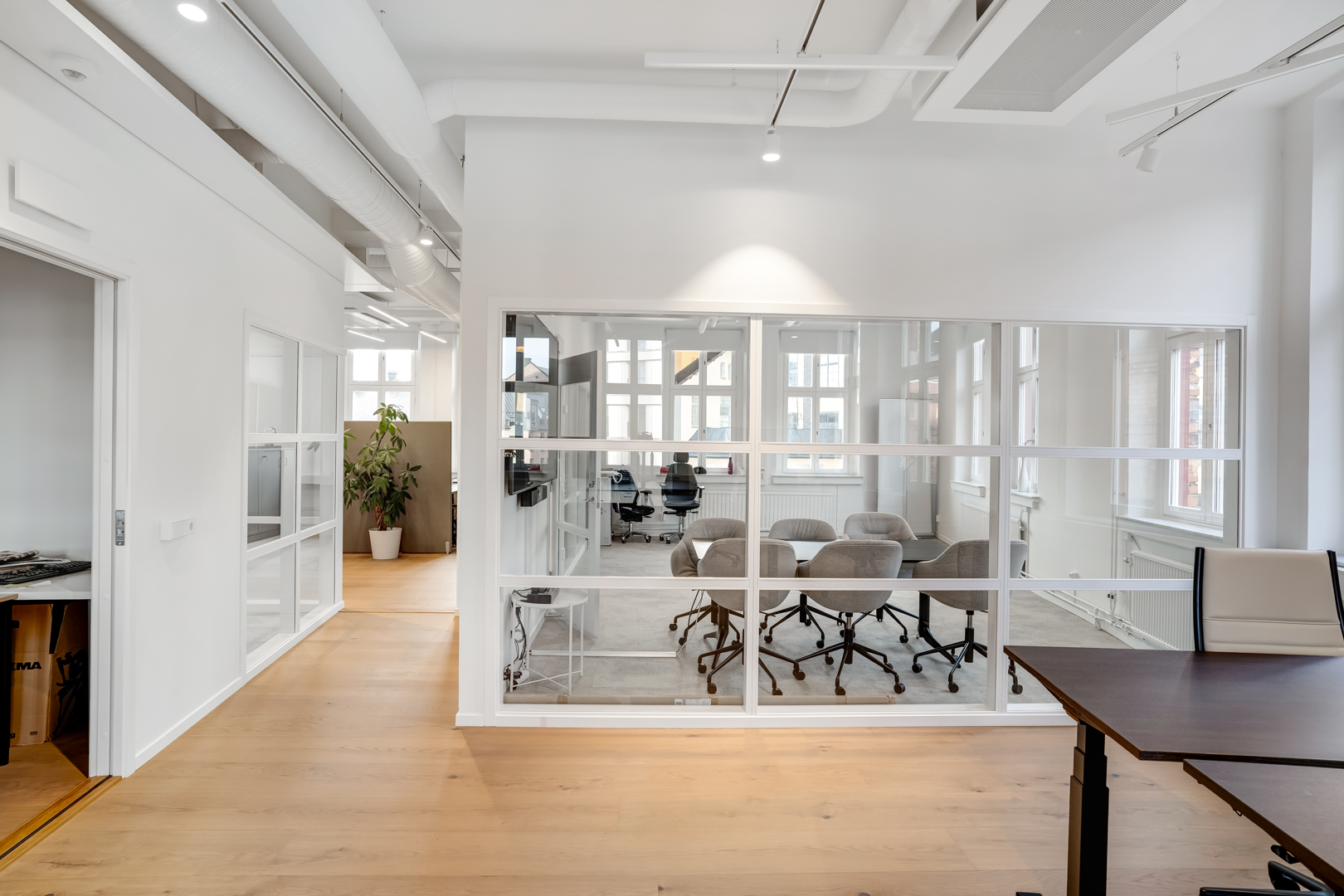 Övre plan har stora öppna ytor med låsbara konferensrum.