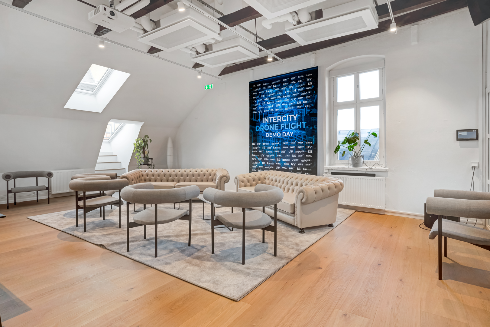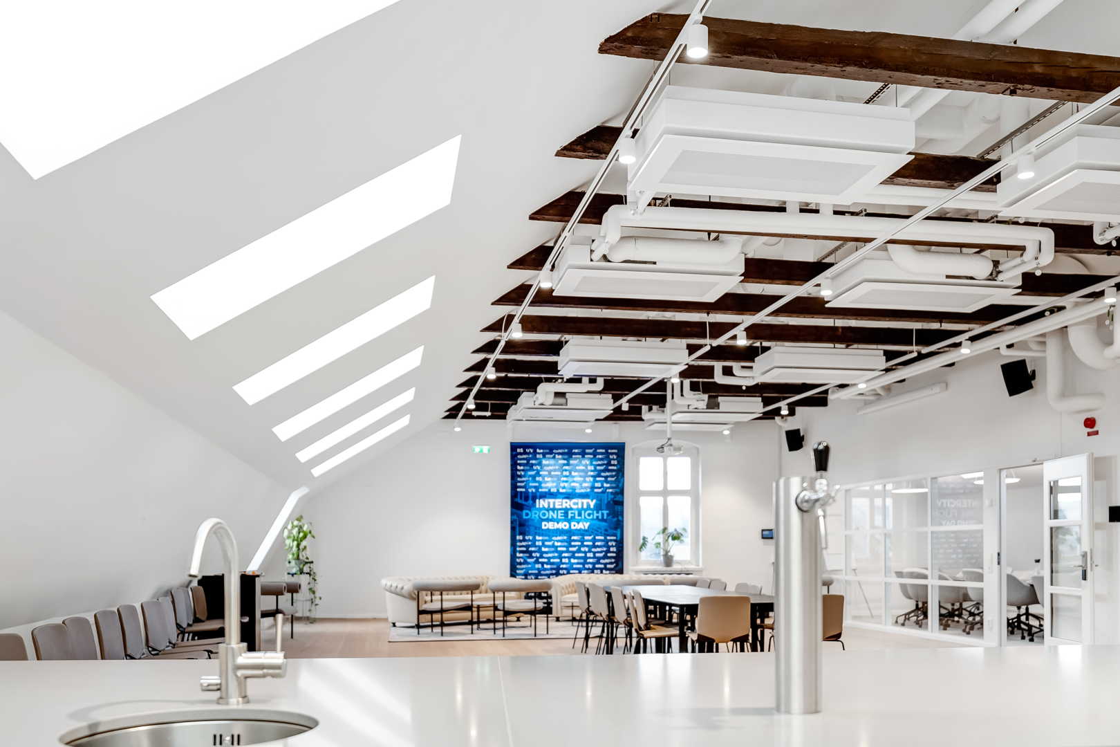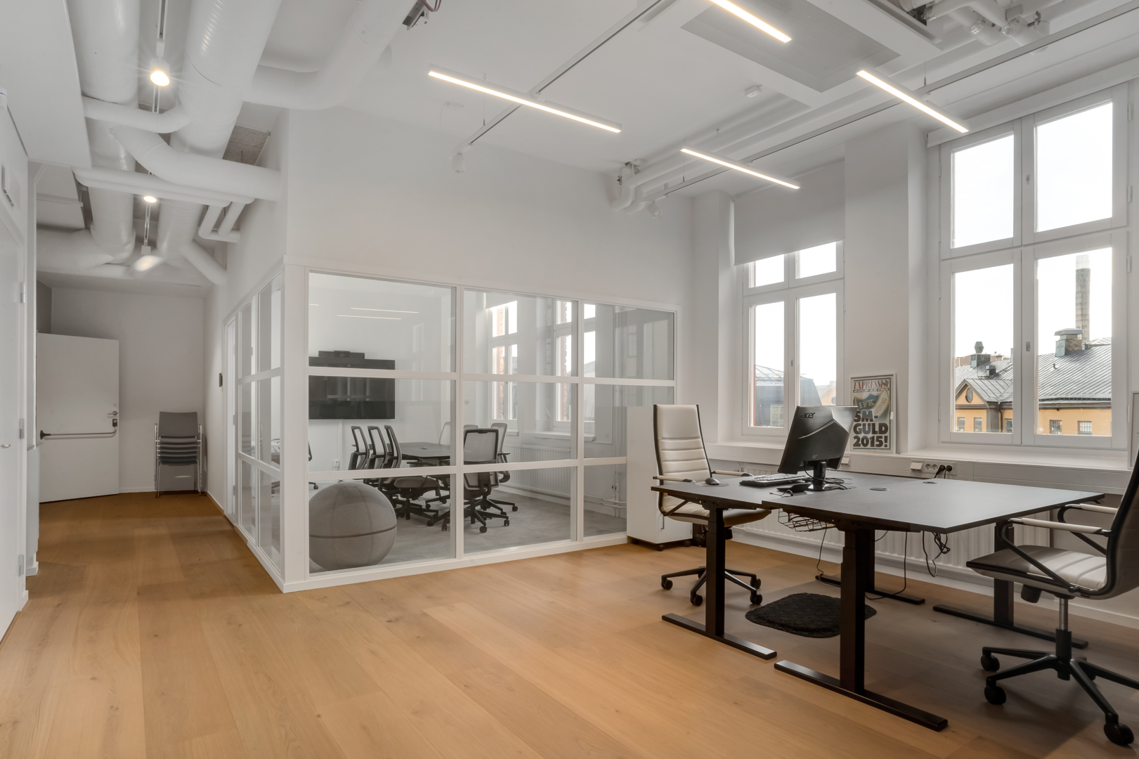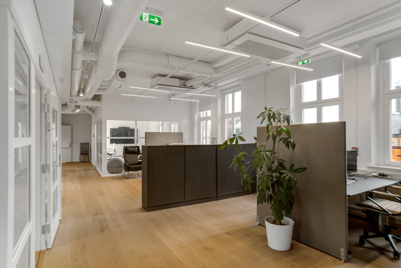 Övre plan har stora öppna ytor med låsbara konferensrum.