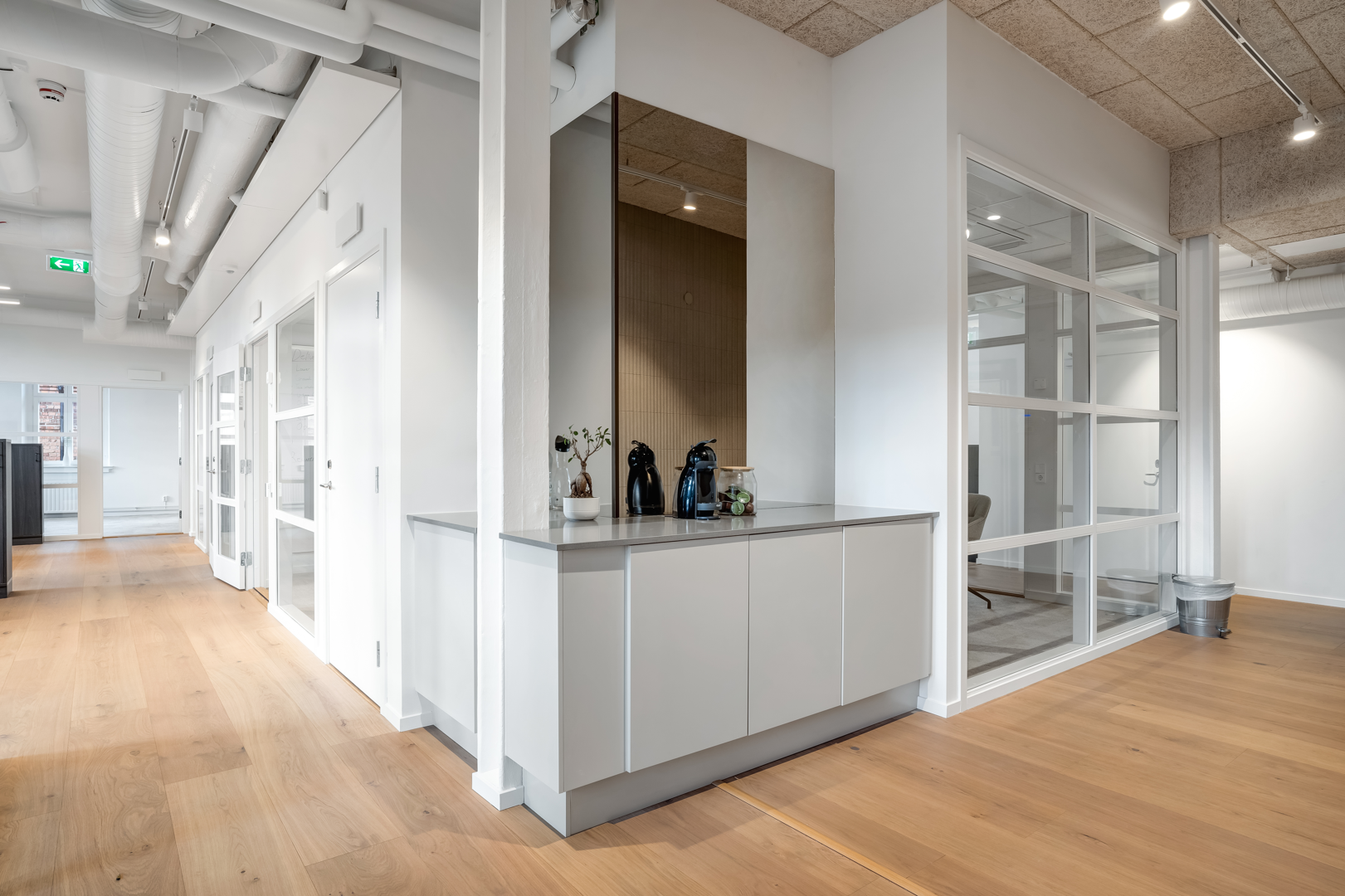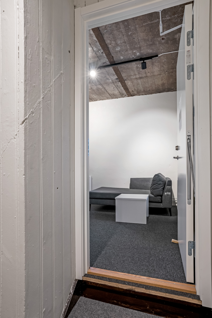 Nedre plan består av kontorsytor, konferensrum och mindre samtalsrum.
