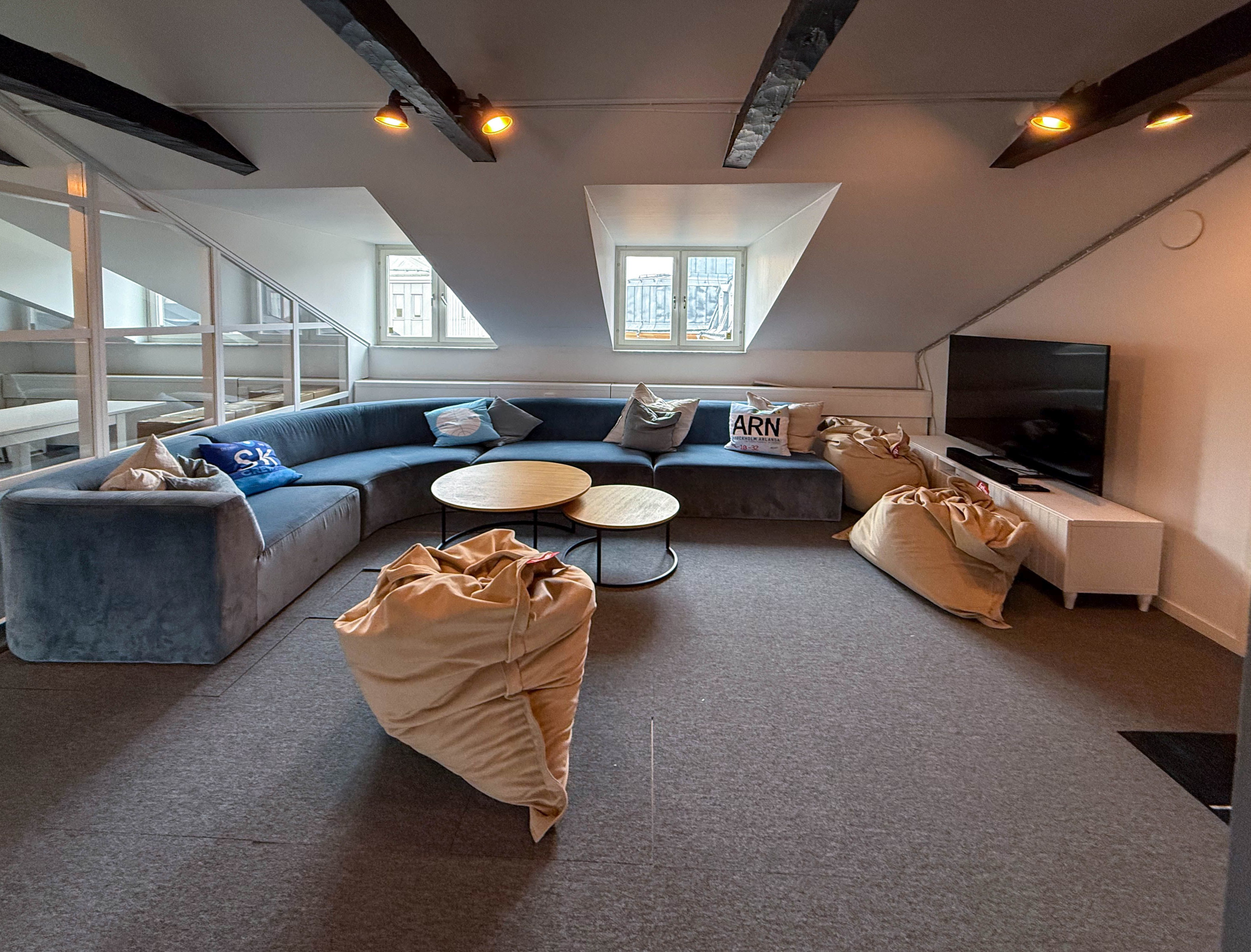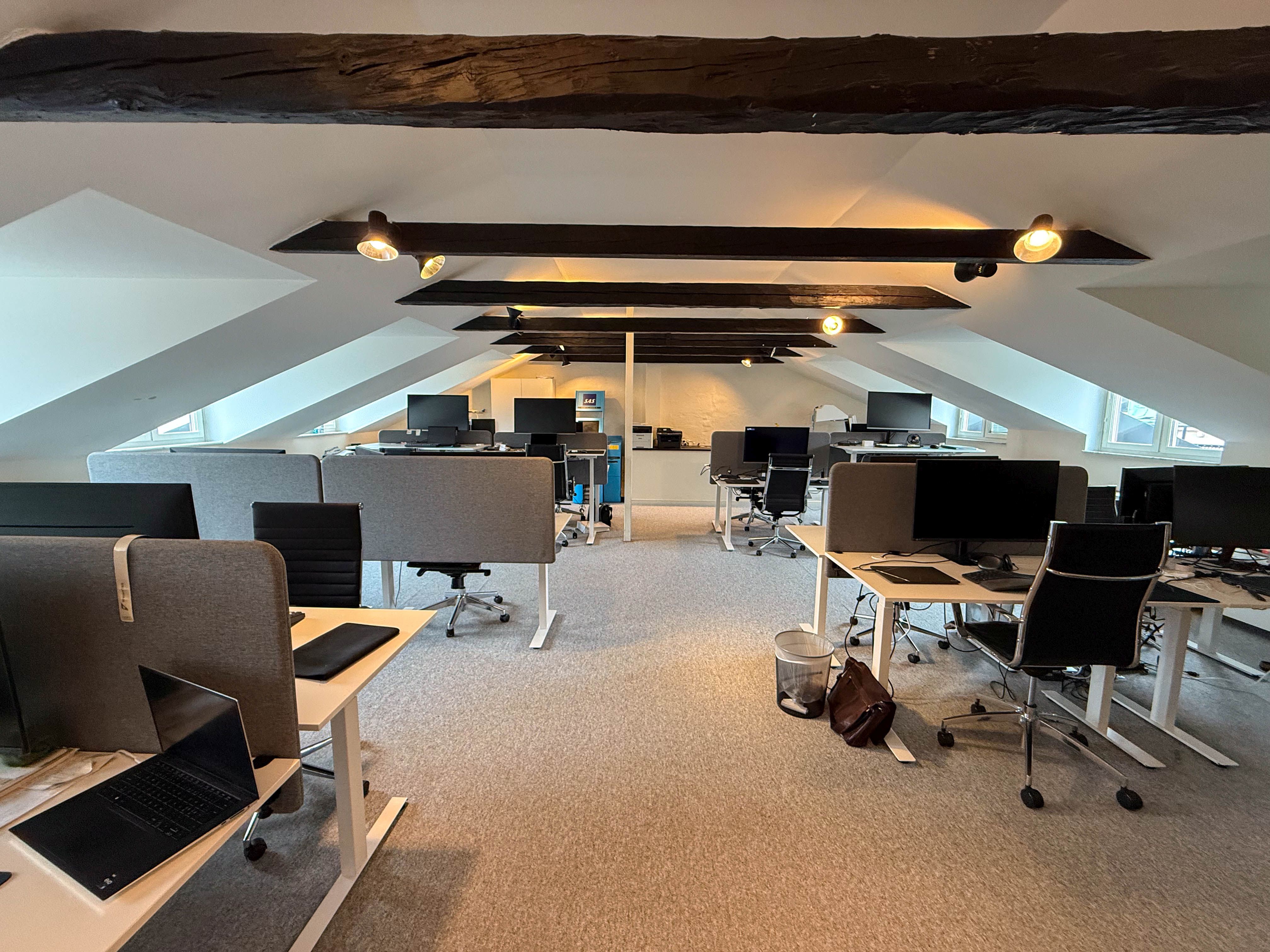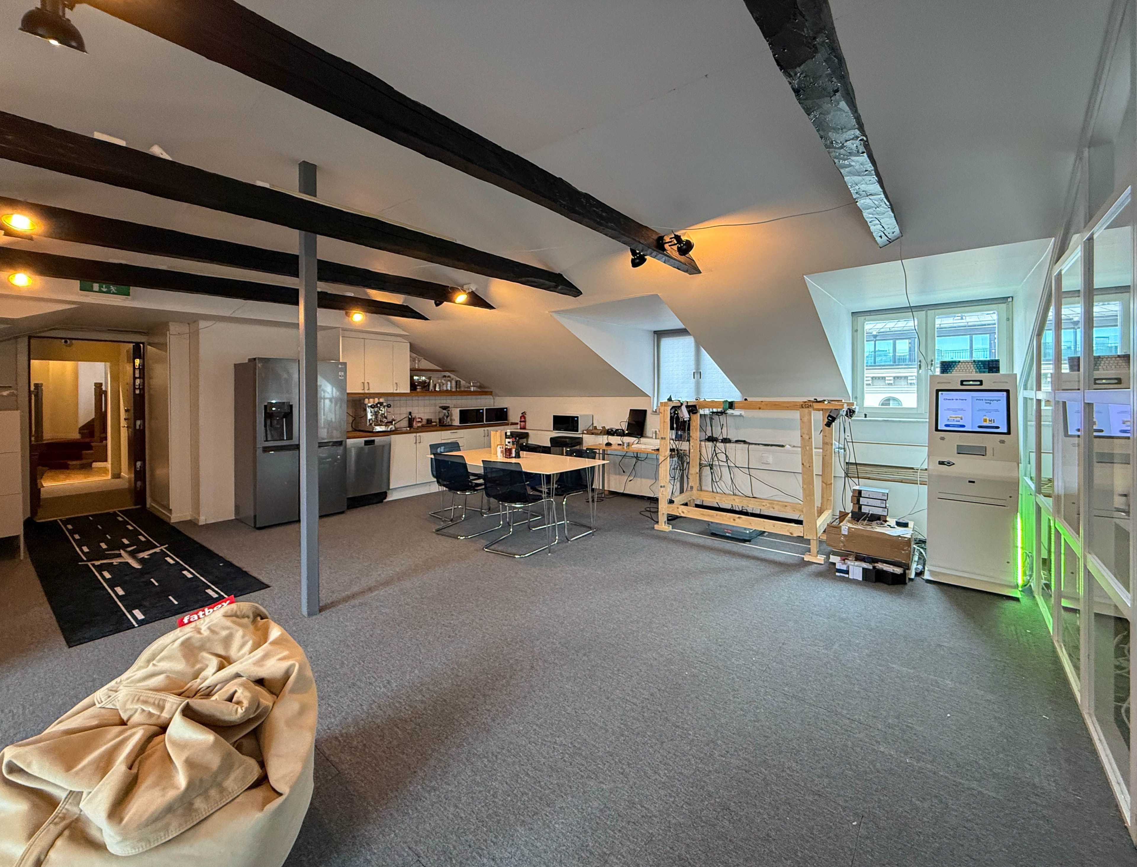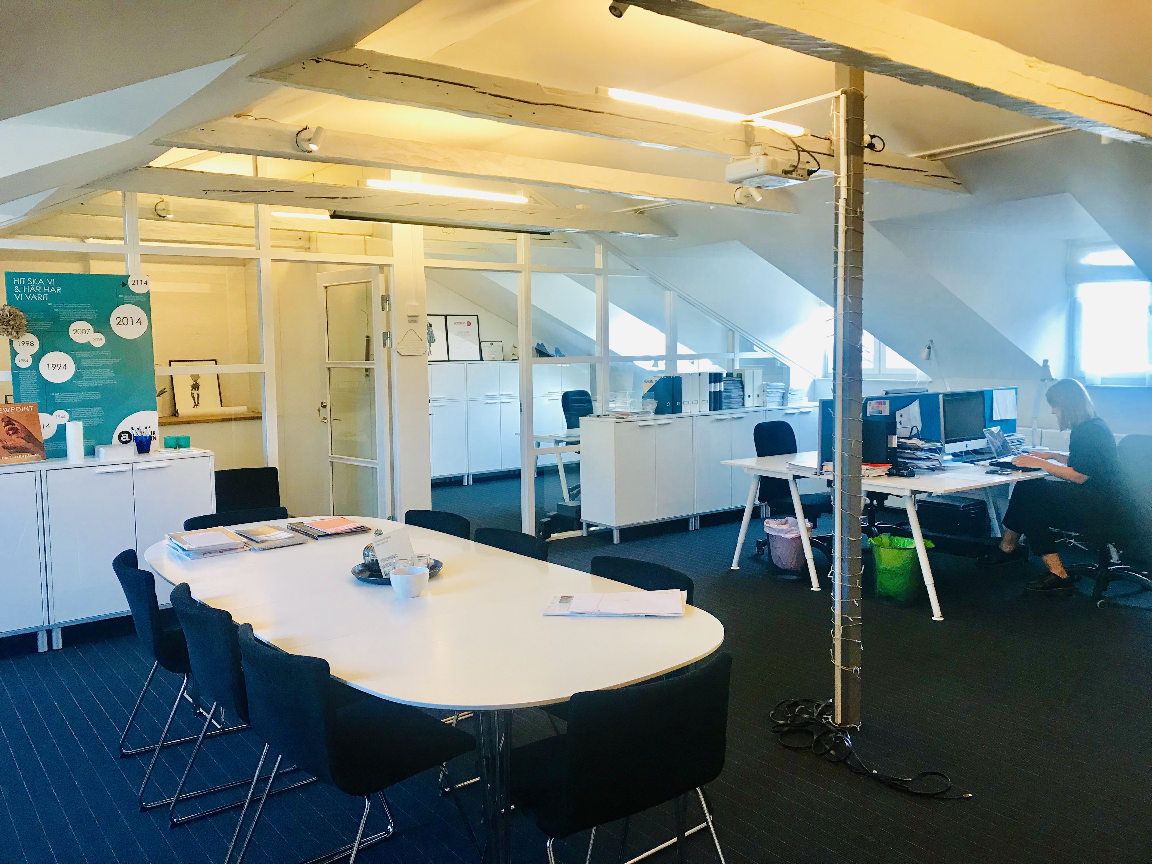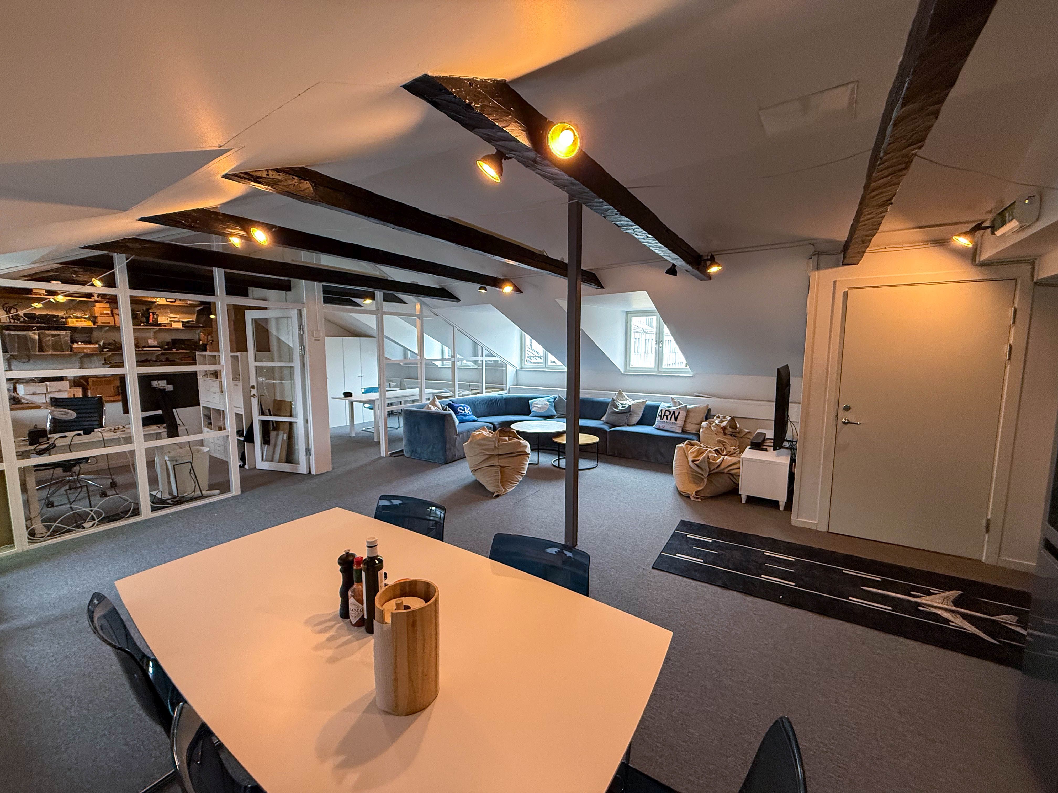 Lokalen erbjuder en inspirerande arbetsmiljö med snedtak, synliga bjälkar och generösa ljusinsläpp.