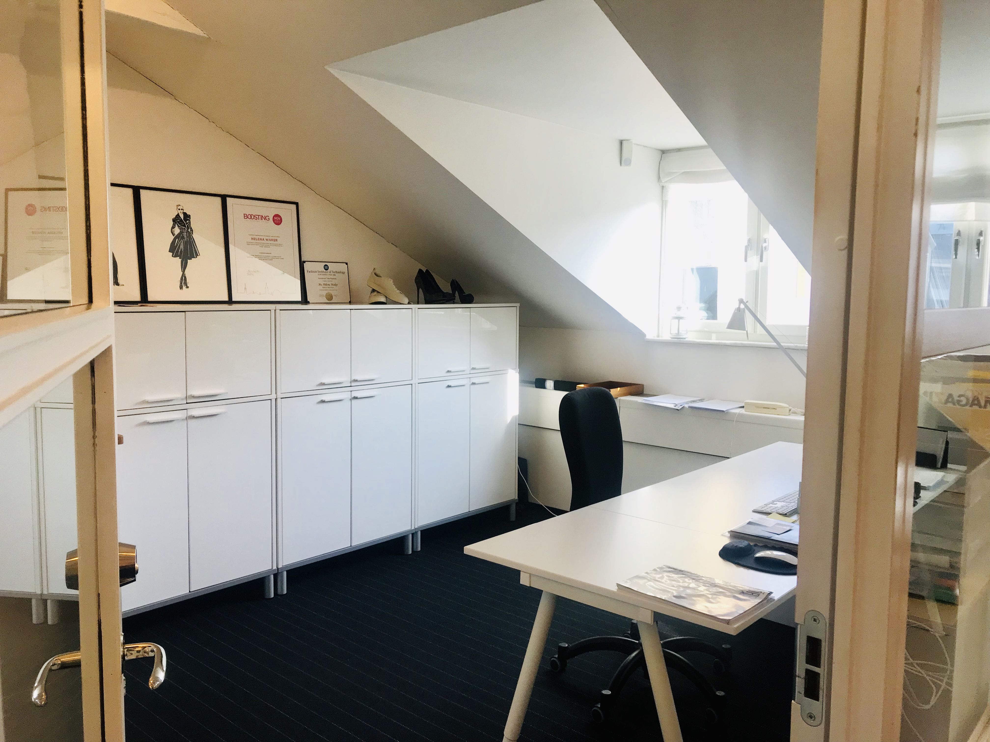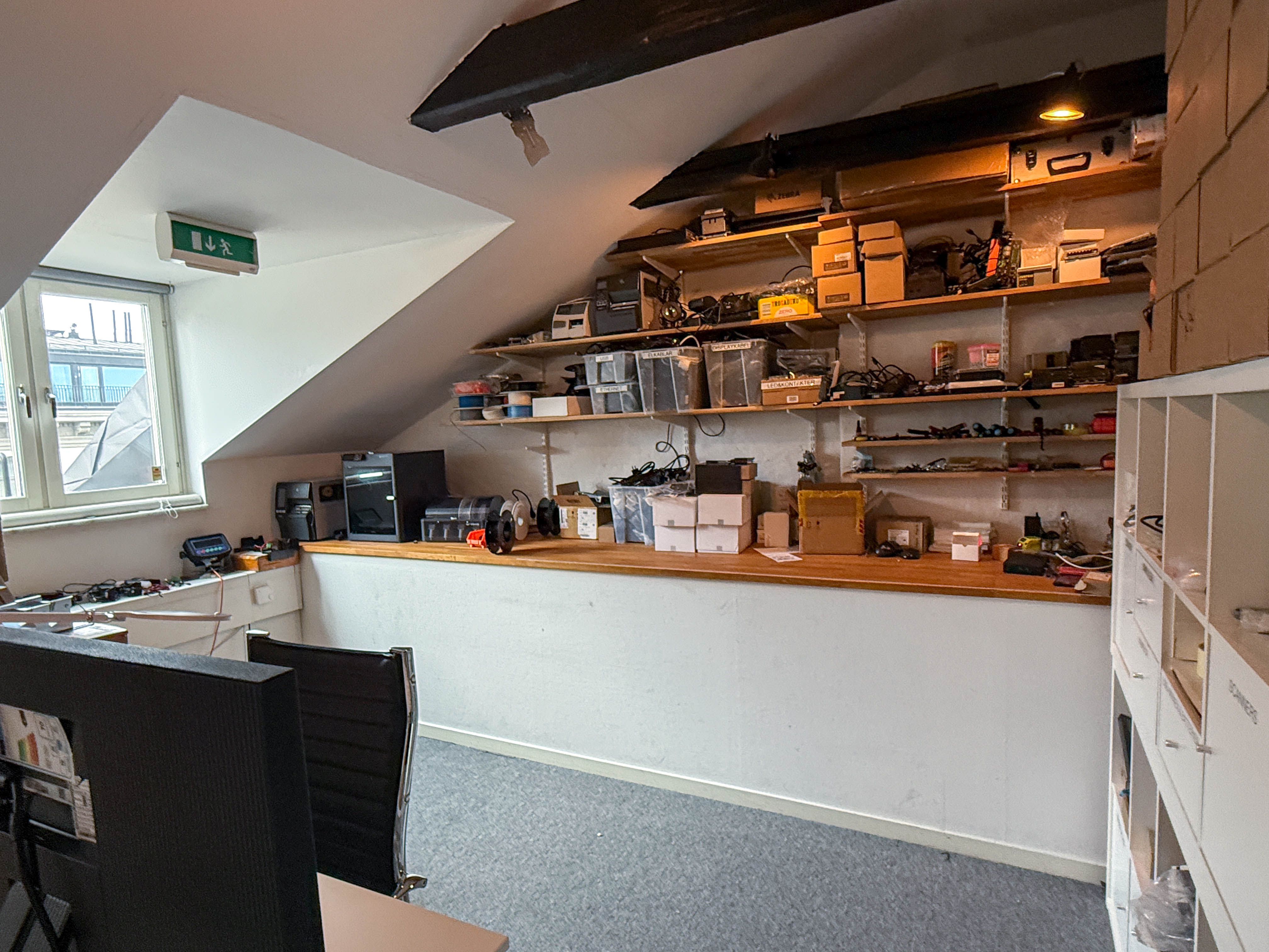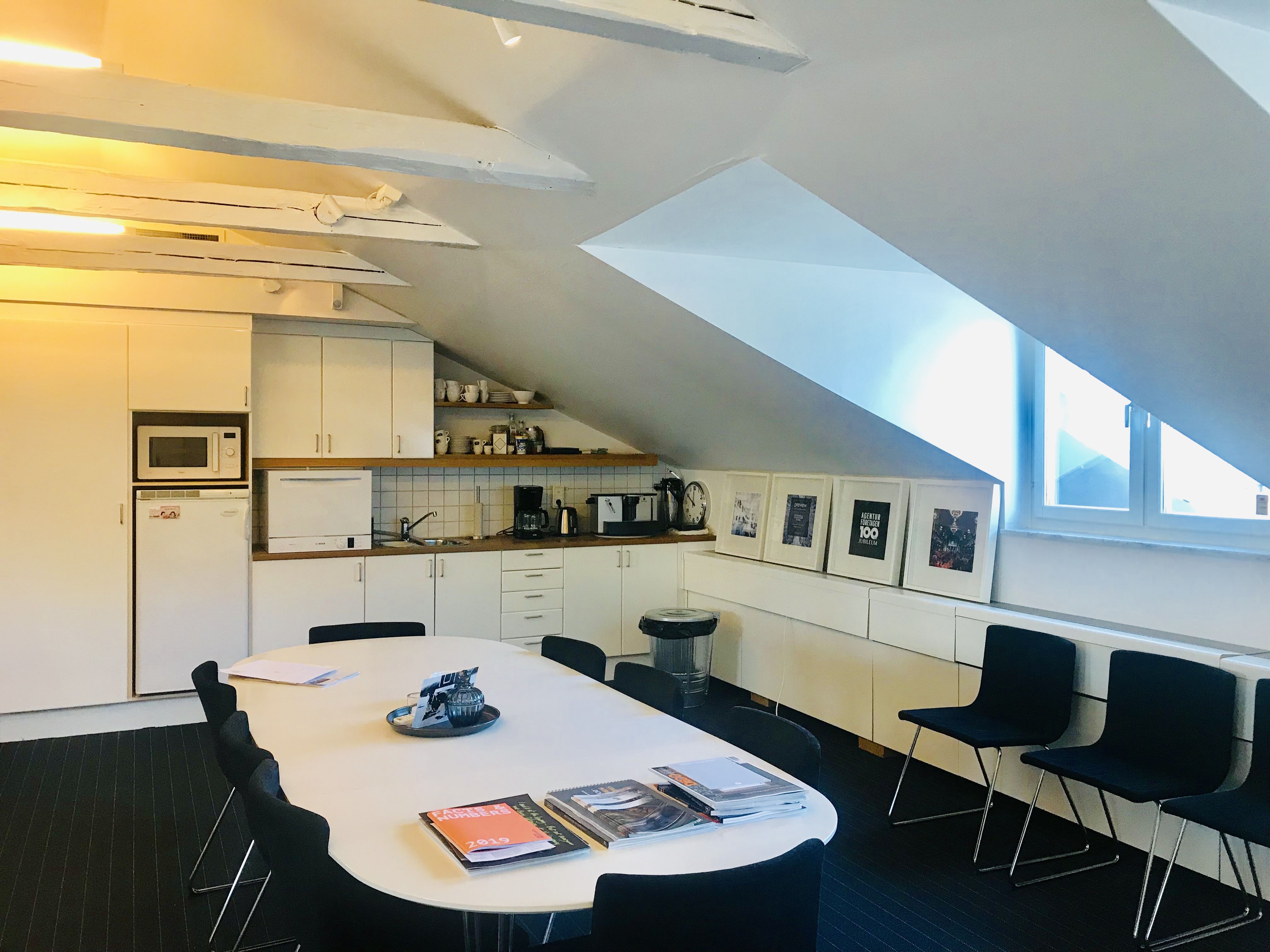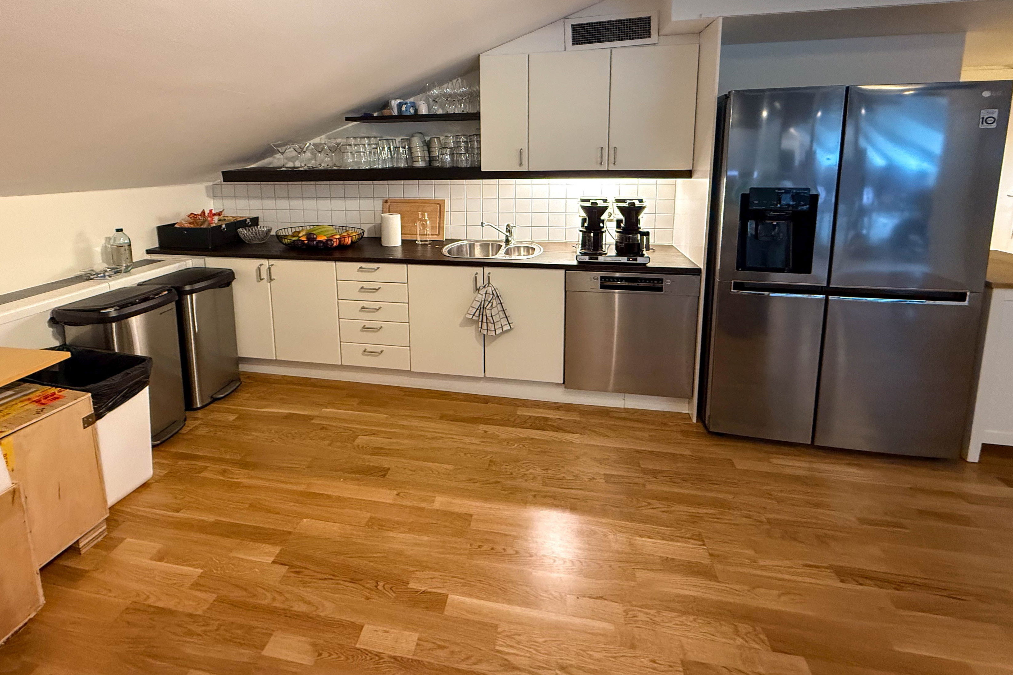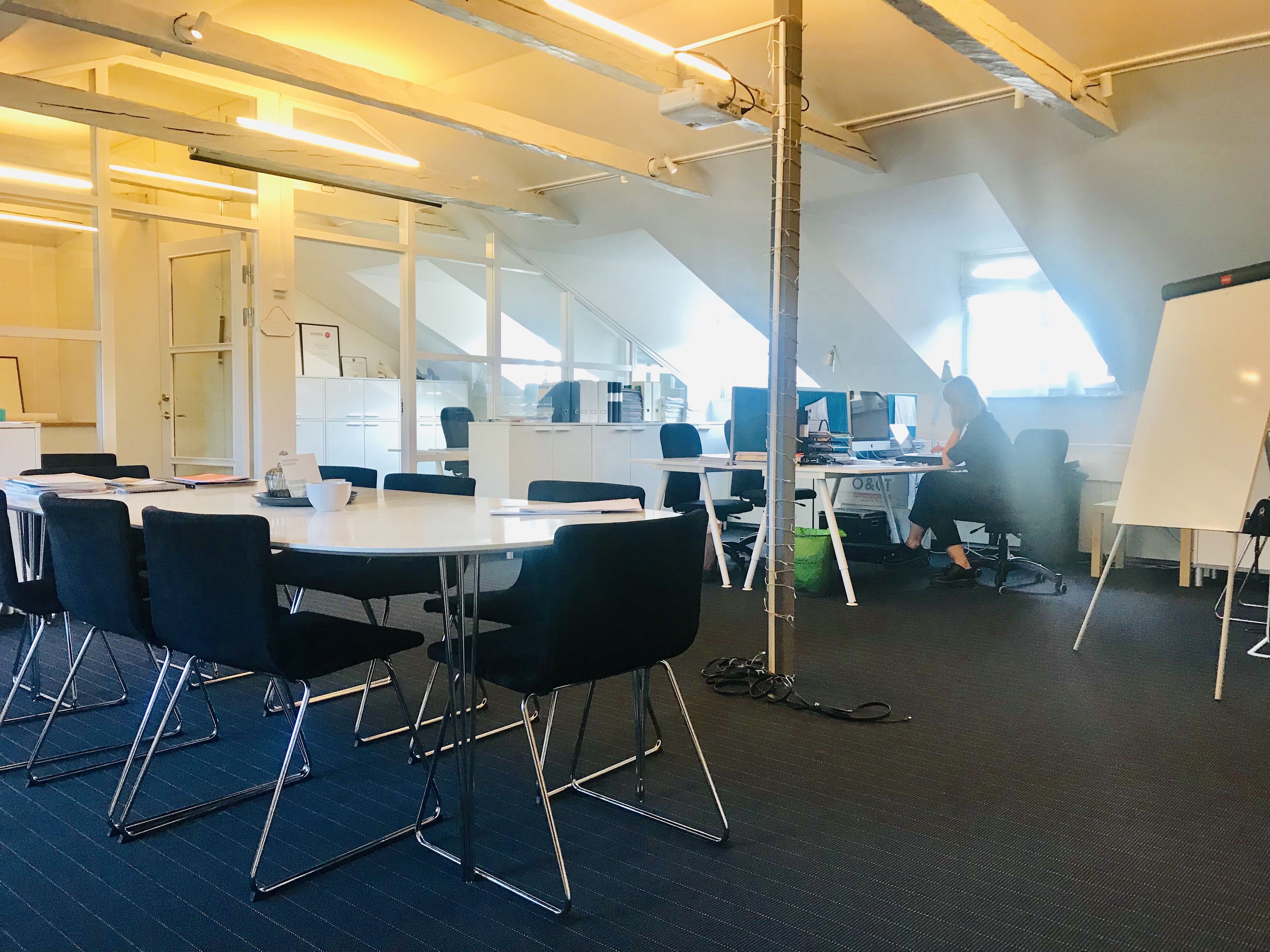 Lokalen erbjuder en inspirerande arbetsmiljö med snedtak, synliga bjälkar och generösa ljusinsläpp.