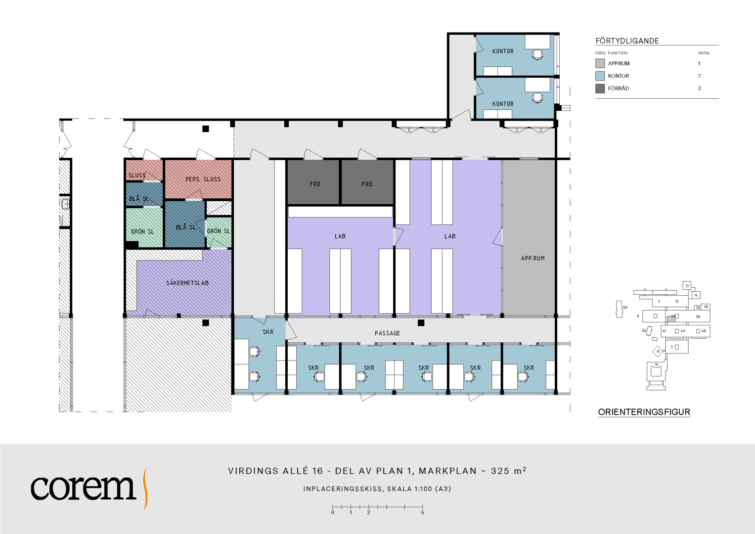 Här erbjuds en inredd labblokal med möjlighet till tryckluft, kvävgas och destillerat vatten. Det finns många kontorsytor/skrivrum som kan användas som enskilda kontorsrum eller för fler personer. Lokalen är inredd med labbänkar, skåp, diskbänk.